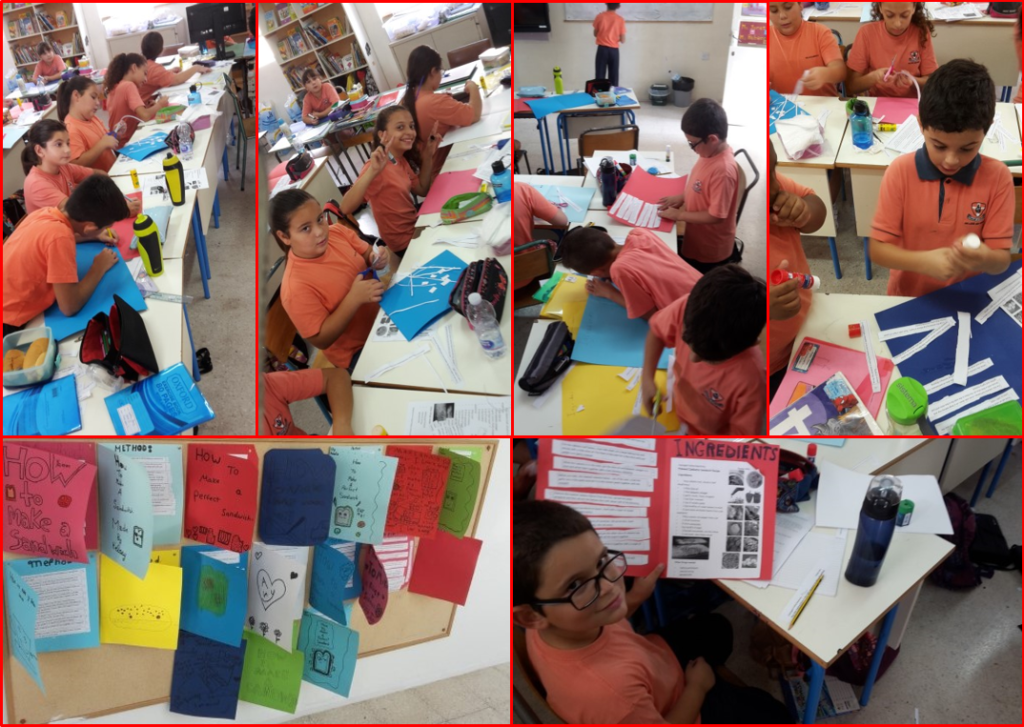 Students were given a set of jumbled instructions. After reading these instructions, students were allowed 7 minutes to sort the instructions. Some children read aloud their instructions according to the ordered they assigned to each. They compares the results while the teacher allowed some peer response. Finally instructions were cut and glued in an order that made sense, forming a card looking like a “Pressed Ciabatta Sandwich”. These cards were displayed on the class notice board.