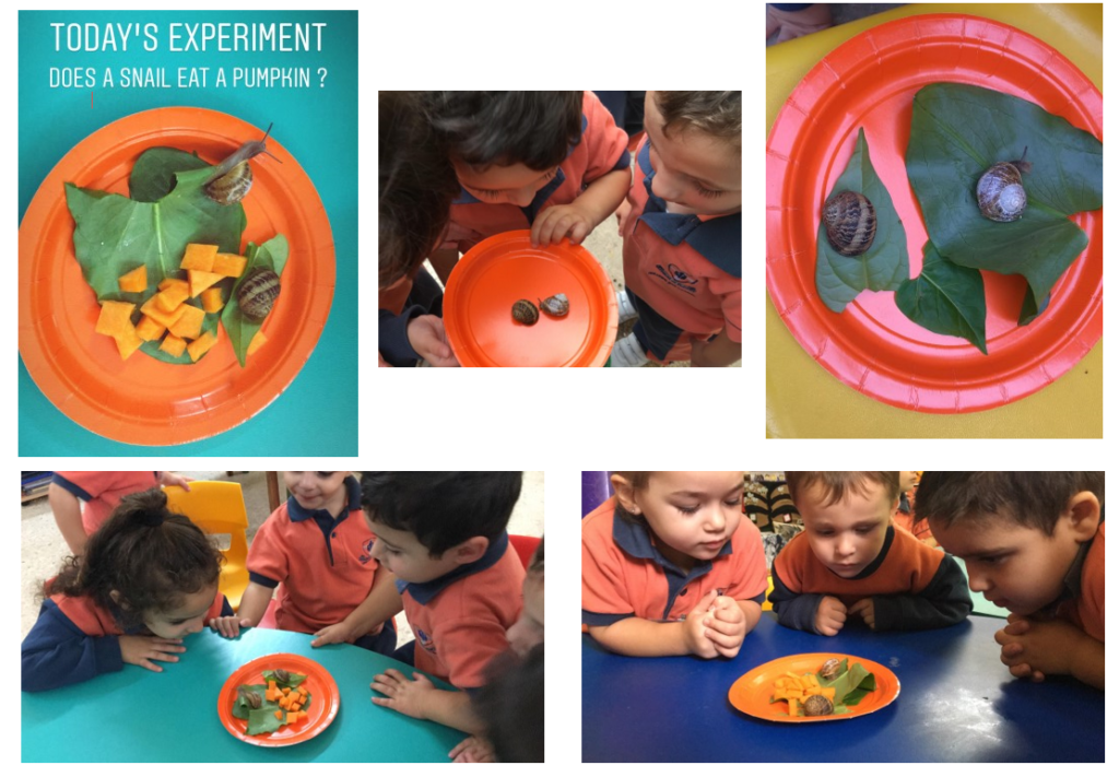 Students looked for snails in the school yard. Then they gave the snails pieces of pumpkin… Through this activity students learnt about what snails like to eat and also about vegetables