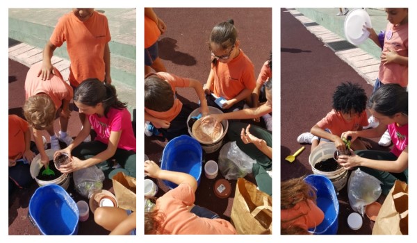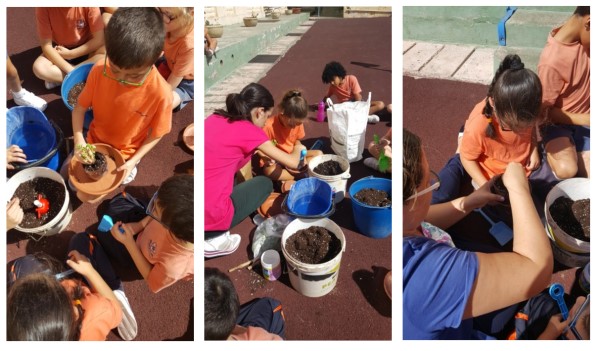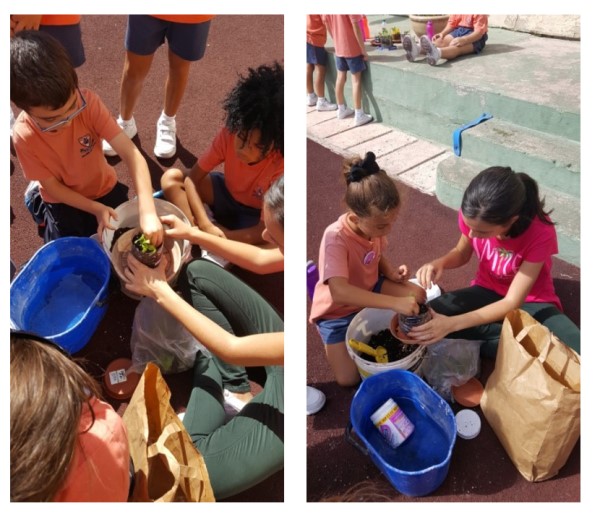 After learning about plants and what is needed for a plant to grow into a healthy one, students went out in the school yard to sew their own plants.
