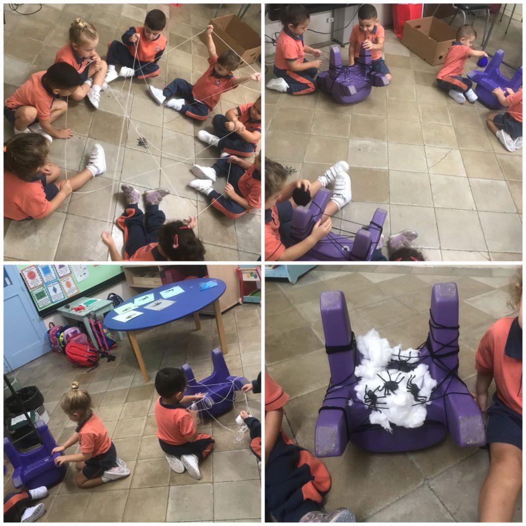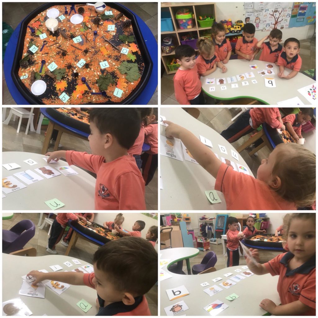 Tuff Tray with spiders, pine cones and natural leaves for the literacy. Learning the vowels and the letter ‘B’ for Brimba. Students are doing letter recognition by matching the letters accordingly.