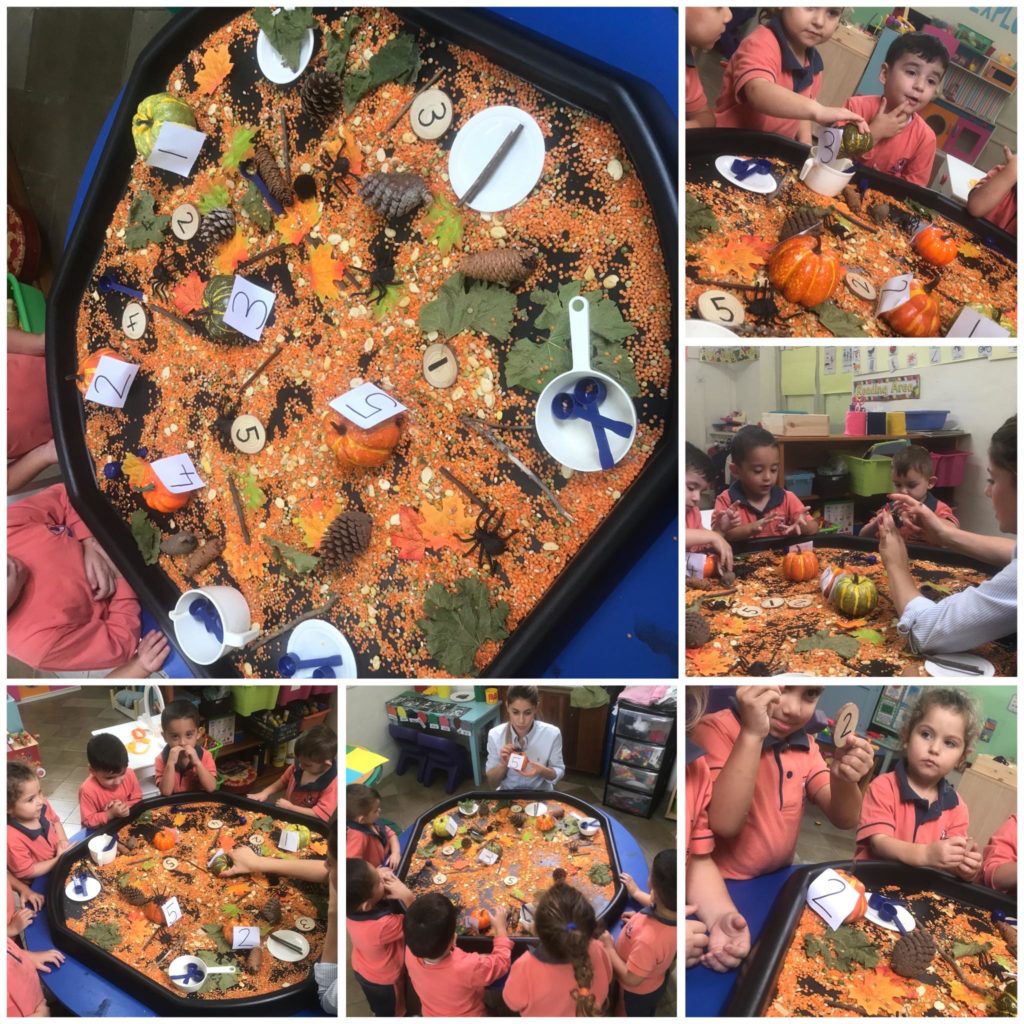 Spiders & Pumpkins Tuff Tray Numbers recognition from 1 till 5. They had to match the pumpkin numbers with the wooden ones. Also counting the value on fingers and fill up the cups accordingly.
