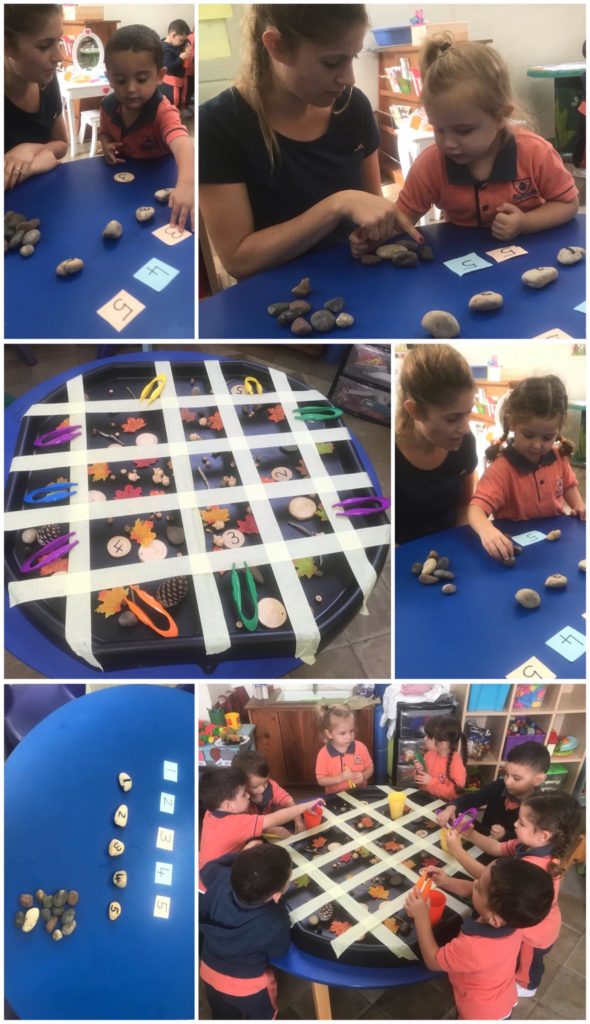 Tuff tray with autumn leaves , acorns , pine cones , tweezers , natural loose parts and numbers from 1 till 5. Learning Number recognition, counting accordingly and colour recognition.