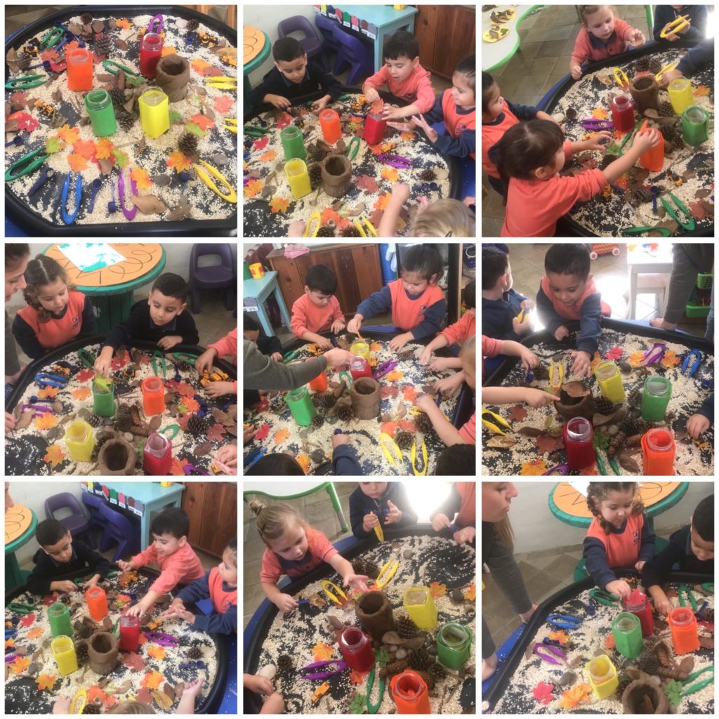 Tuff tray with autumn leaves for colour sorting and recognition.