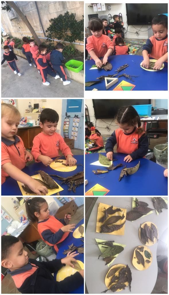 We went outside to pick up dried leaves. We created a collage for the shape recognition.